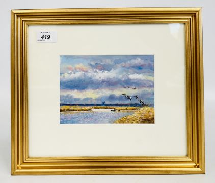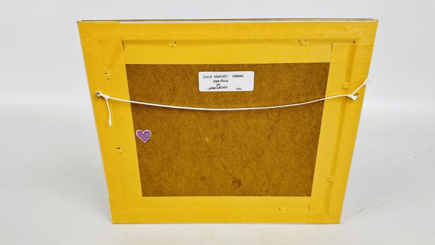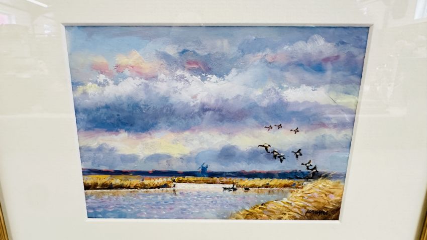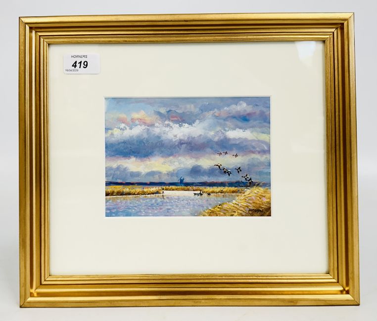 A FRAMED AND MOUNTED OIL ON BOARD TITLED "DUCK HORSEY MERE NORFOLK" BEARING SIGNATURE JAMES ALLEN, W 17.5CM X H 12.5CM.