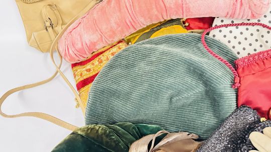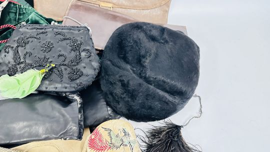 A COLLECTION OF VINTAGE LADIES CLOTHING TO INCLUDE HATS, BAGS AND GLOVES ETC.