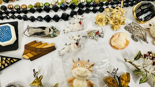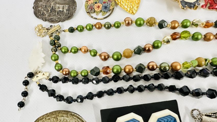 A GROUP OF COSTUME JEWELLERY TO INCLUDE ENAMEL BROOCHES, PENDANTS AND BEADED NECKLACES ETC.