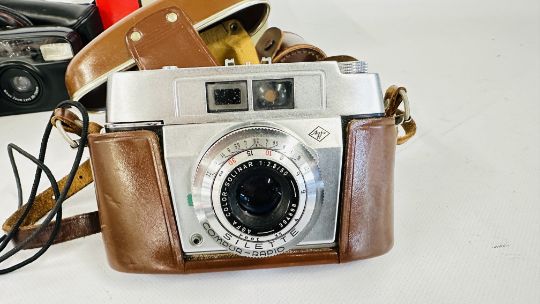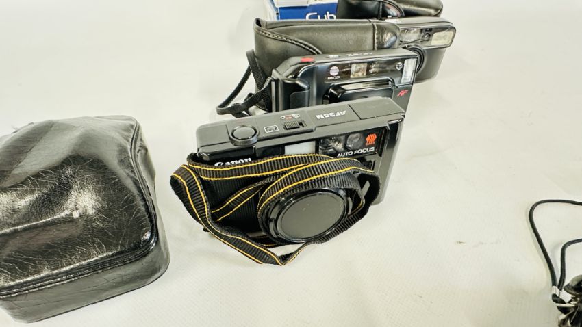 A BOX OF ASSORTED PHOTOGRAPHIC EQUIPMENT TO INCLUDE MINOLTA, NIKON, SONY EXAMPLES AND A CANON AF35M STILL CAMERA AND CASE, IN ORIGINAL BOX.