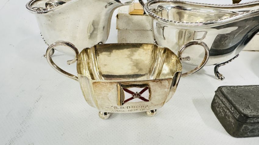 A PAIR OF GOOD QUALITY SILVER PLATED SAUCE BOATS + A GROUP OF VINTAGE DRAWING MEASURES TO INCLUDE PANTOGRAPH + A JOHN RABONE & SONS WIRED TAPE + A VINTAGE CROWN-MOLECTRIC LIGHTER BY COLIBRI IN FITTED CASE AND A VINTAGE ENGRAVED PEWTER HINGED SNUFF BOX DEPICTING A LOCKED ANTLERS SCENE + A TWO HANDLED BASIN WITH AN APPLIED ENAMEL FLAG ENGRAVED S.S. ORUBA APRIL 16th 1910 + A VINTAGE PACKET OF SOBRANIE BLACK RUSSIAN CIGARETTES, SEALED (COLLECTORS ITEM ONLY).