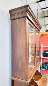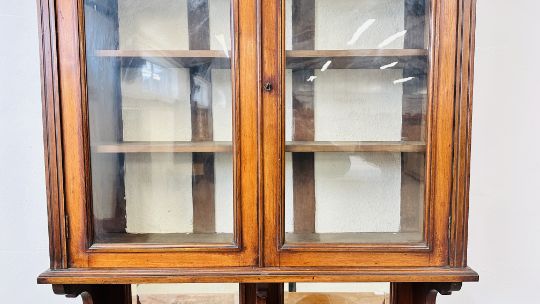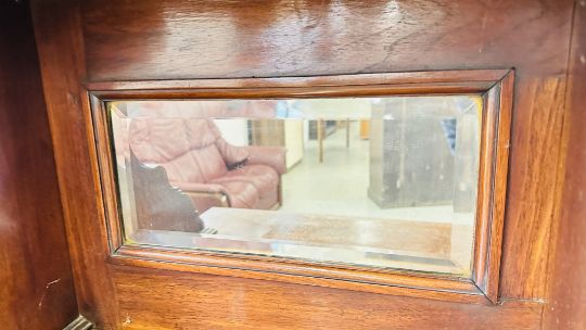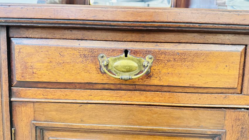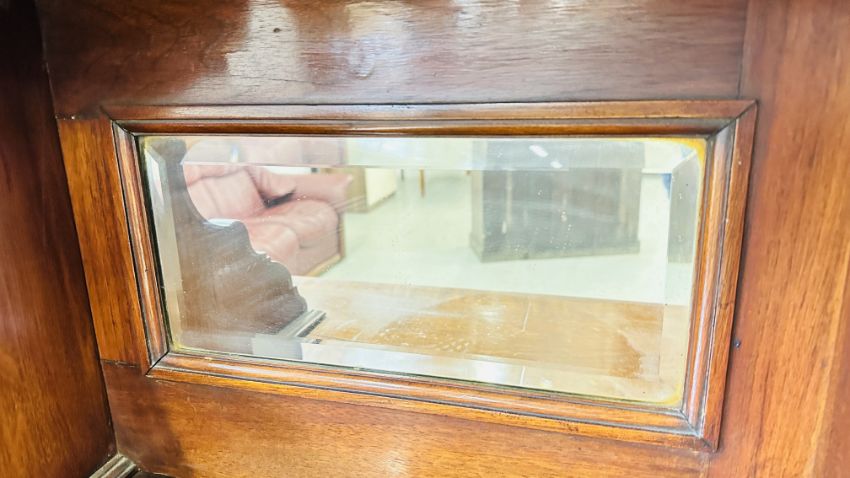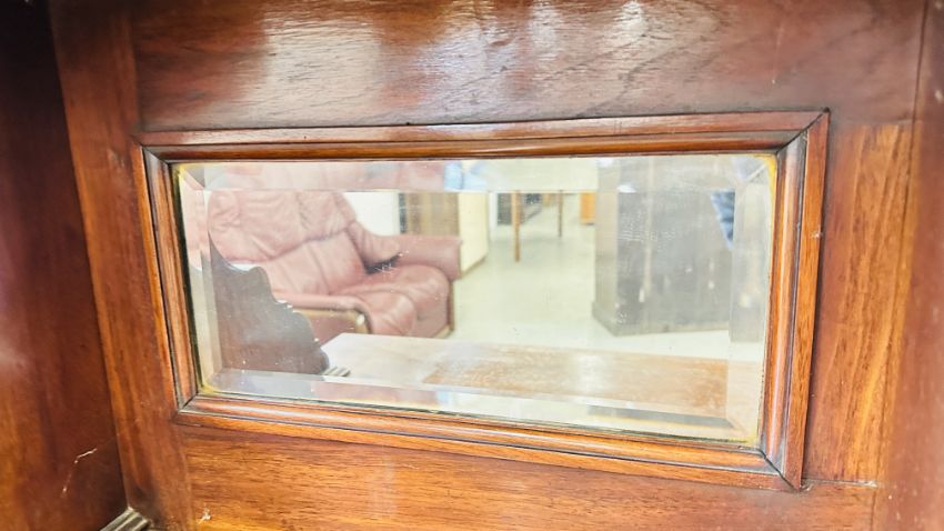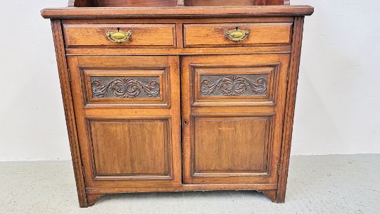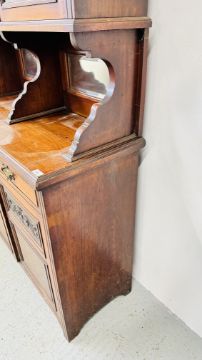 AN EDWARDIAN MAHOGANY DRESSER, THE GLAZED CASED TWO DOOR DISPLAY ABOVE A TWO DRAWER AND CUPBOARD BASE. (KEY WITH AUCTIONEER).