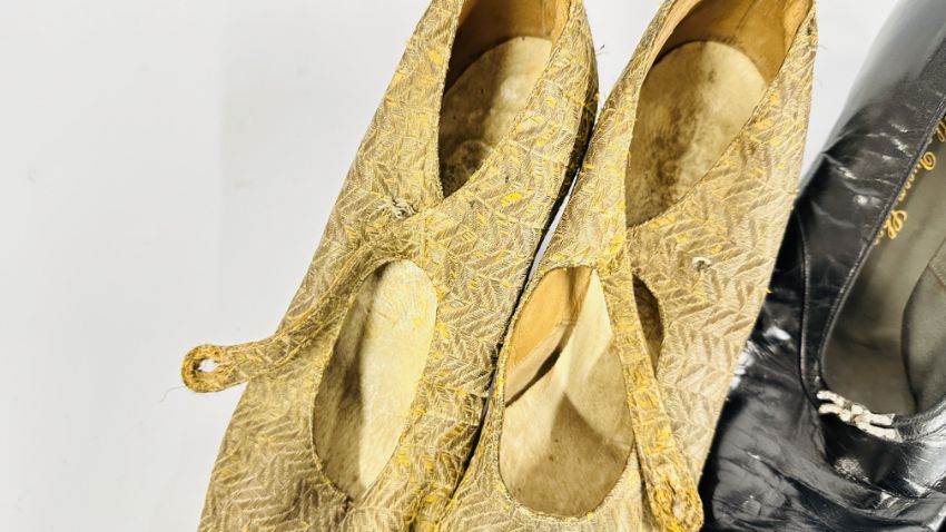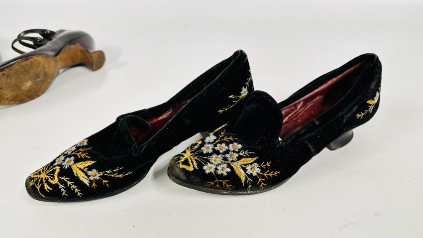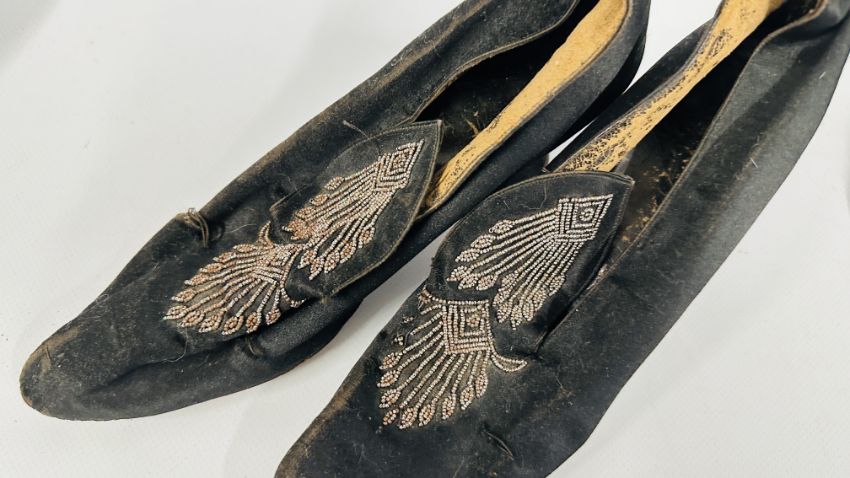 FIVE PAIRS OF ANTIQUE LADIES COURT SHOES TO INCLUDE CUT STEEL DECORATED, HAND EMBROIDERED AND THE QUEEN SHOE EXAMPLES.