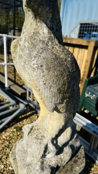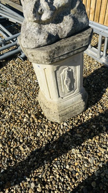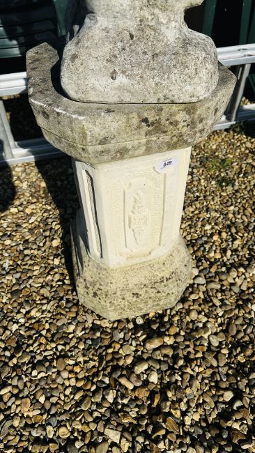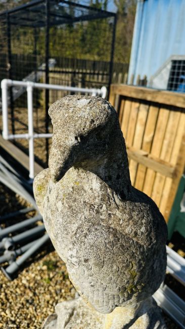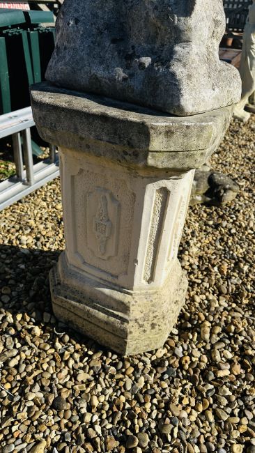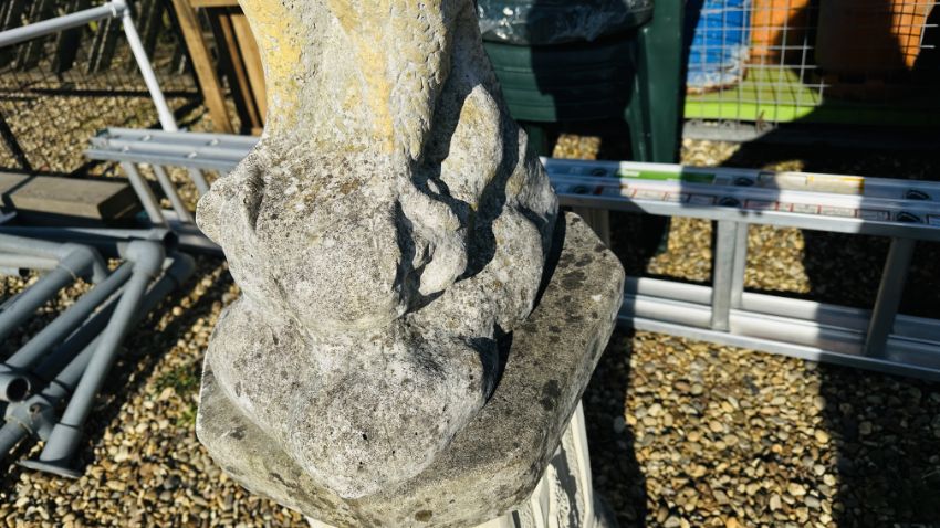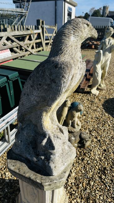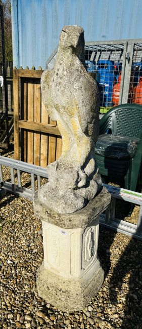 A LARGE STONEWORK "EAGLE" GARDEN ORNAMENT ON PLINTH BASE, OVERALL HEIGHT 137CM.