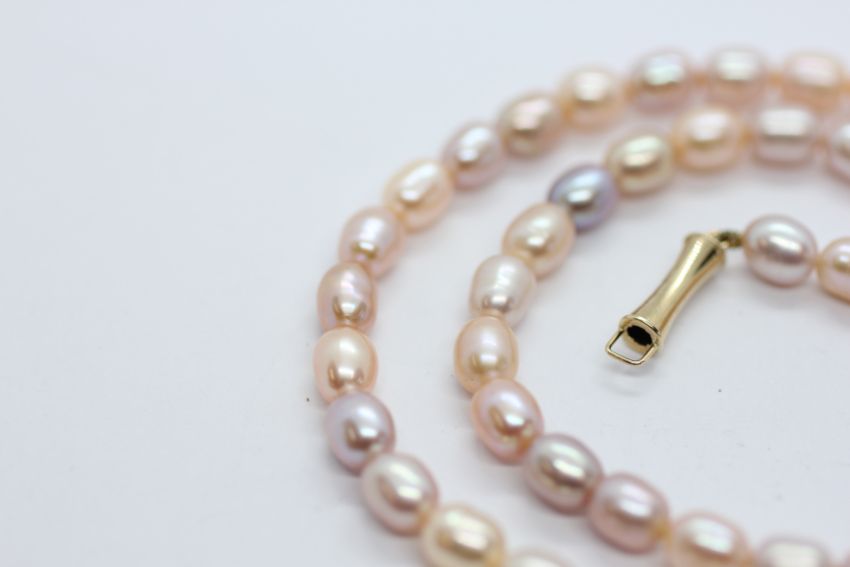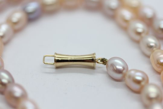 A CASED SET OF 'CLASSIQUE' PEARLS WITH CLASP MARKED 14K.