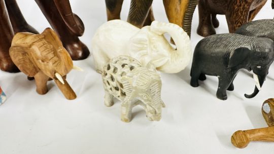A GROUP OF HARD STONE AND CARVED WOODEN ELEPHANTS, THE LARGEST 33CM HIGH AND ONE CERAMIC EXAMPLE (14 ITEMS).