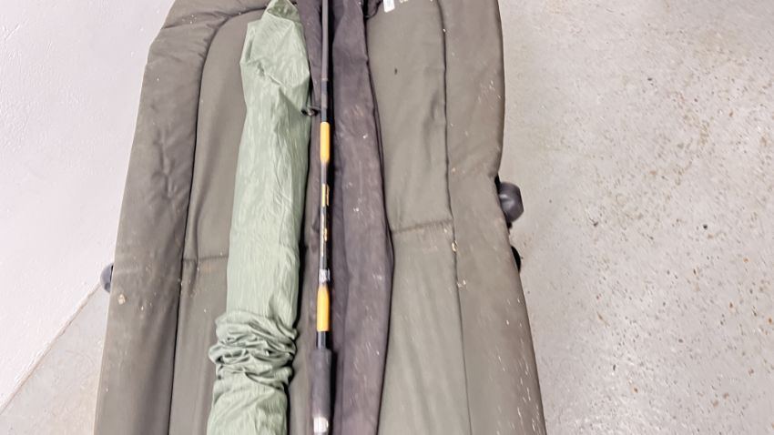 CHUB FOLDING FISHING BED, FISHING UMBRELLA AND SHAKESPEARE SPECIMEN PIKE ROD
