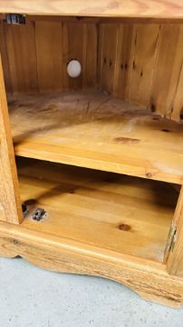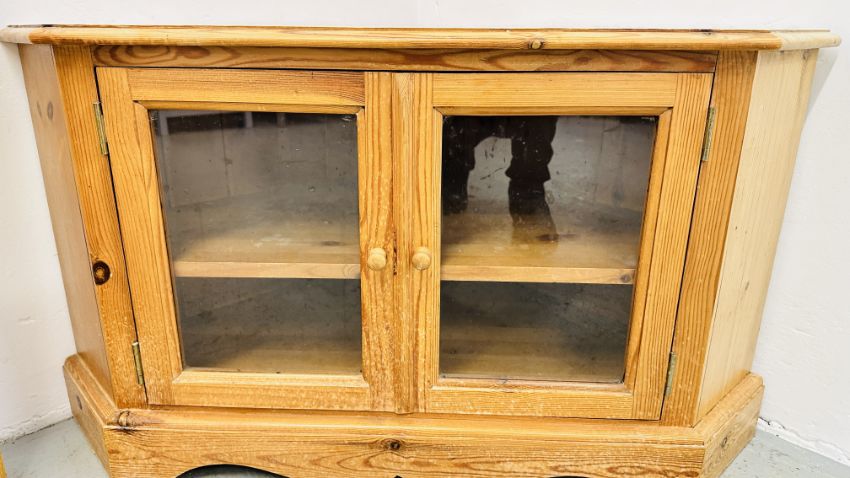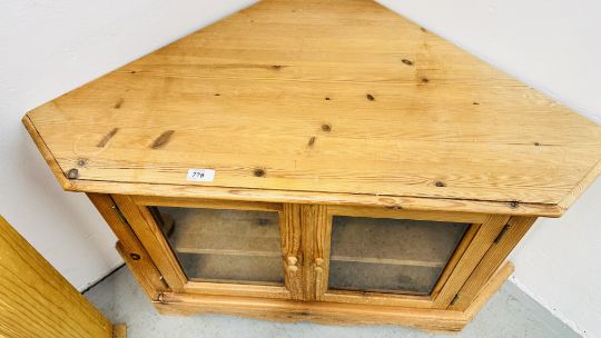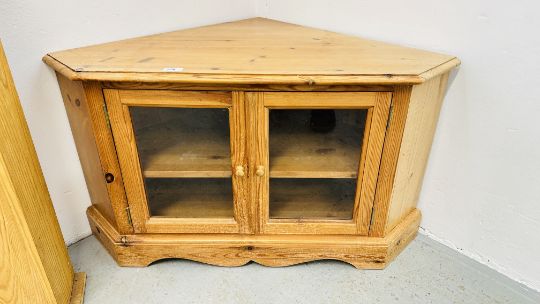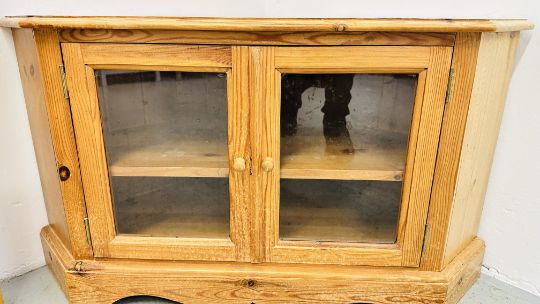 A WAXED PINE GLAZED TWO DOOR CORNER STAND + A HAND CRAFTED PINE STORAGE BOX.