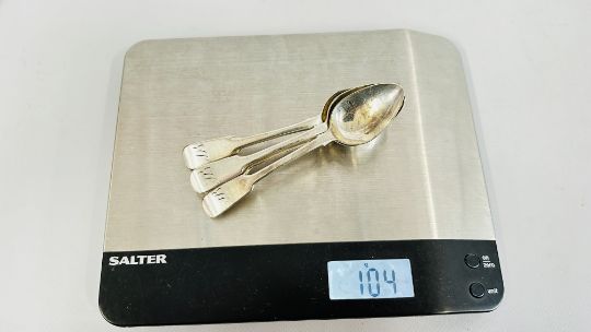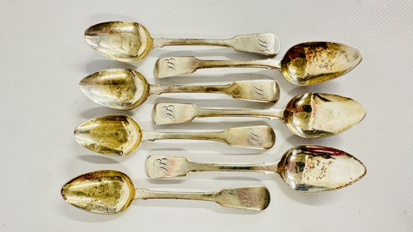 A SET OF 7 ANTIQUE SILVER SPOONS LONDON 1825 INDISTINCT MAKERS MARK.