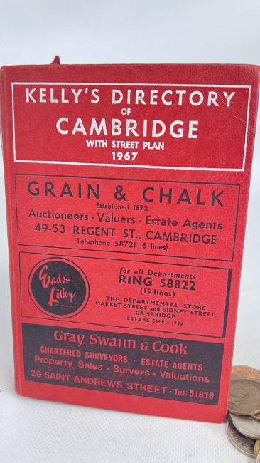 A 1967 KELLY'S DIRECTORY OF CAMBRIDGE + A QUANTITY OF COINAGE TO INCLUDE A SILVER SOUTH AFRICAN 18984 HALF CROWN.