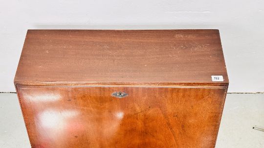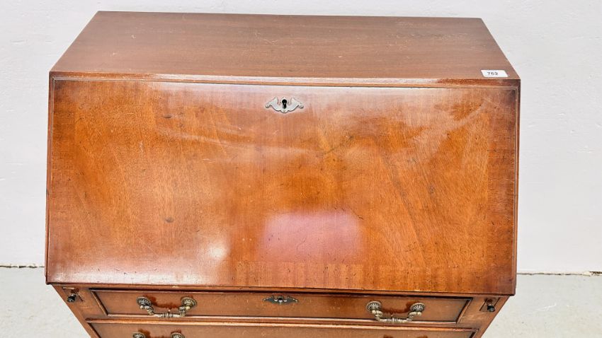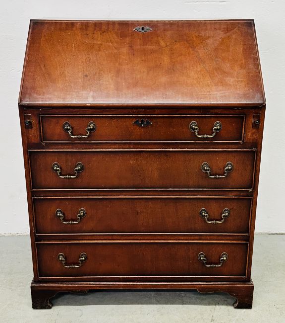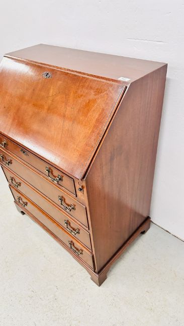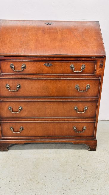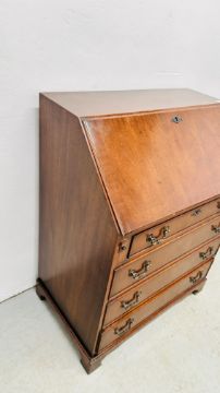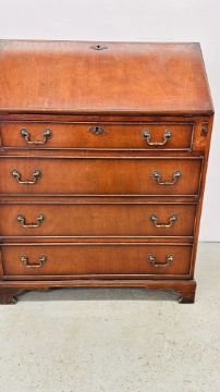 A REPRODUCTION MAHOGANY FOUR DRAWER FALLING FRONT WRITING BUREAU.