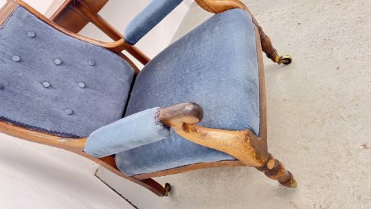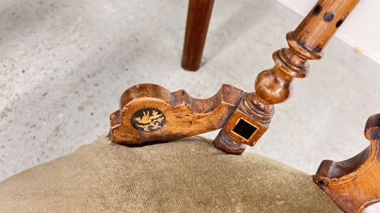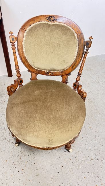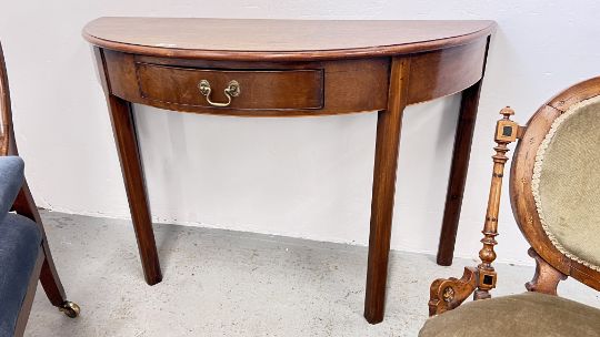 A GEORGE III MAHOGANY D SHAPED SIDE TABLE WITH FRIEZE DRAWER, ANTIQUE VICTORIAN WALNUT NURSING CHAIR WITH INLAID DETAIL AND ANTIQUE BUTTON BACK ARMCHAIR.