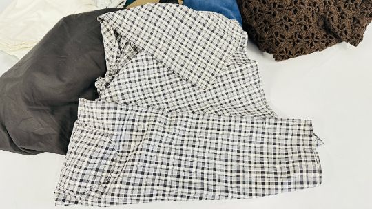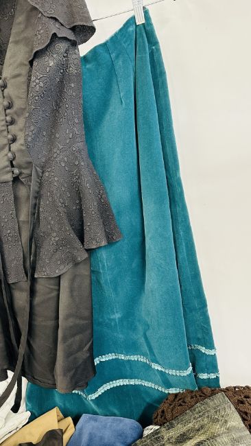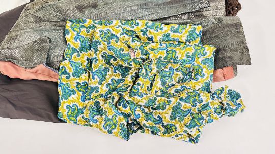 A COLLECTION OF VINTAGE AND 1970'S LADIES CLOTHING TO INCLUDE SNAKESKIN JACKET, PAISLEY INDIAN DRESS, CROCHET SKIRT, TROUSERS, VELVET SKIRT ETC.