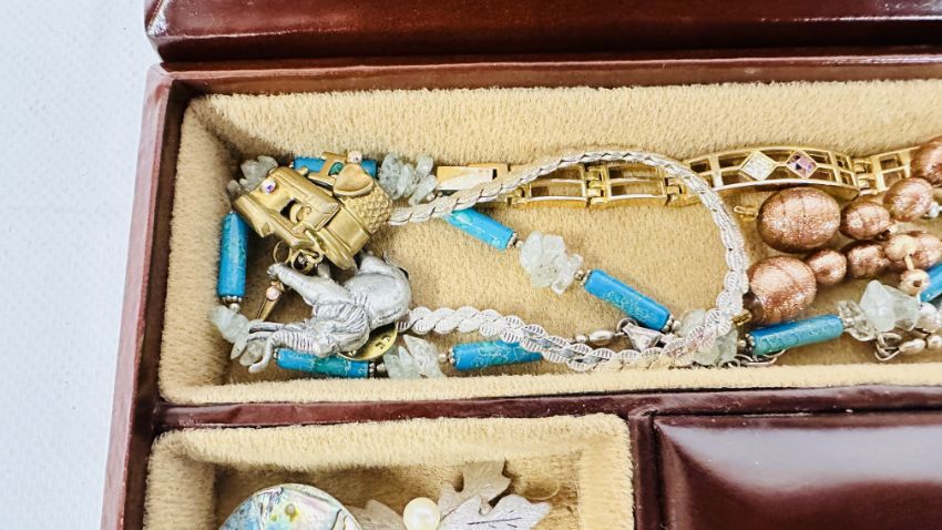 A TAN LEATHERED JEWELLERY CASKET AND CONTENTS TO INCLUDE COSTUME JEWELLERY, AMBER AND SILVER ITEMS.