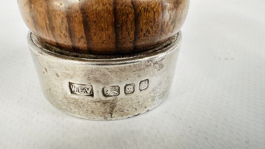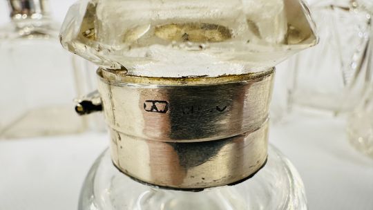 A GROUP OF VINTAGE GLASS SCENT BOTTLES AND DRESSING TABLE JARS TO INCLUDE SILVER AND WHITE METAL EXAMPLES + A WHITE METAL MOUNTED INK WELL AND A SILVER MOUNTED GRINDER LONDON ASSAY MAKER W.E.V.