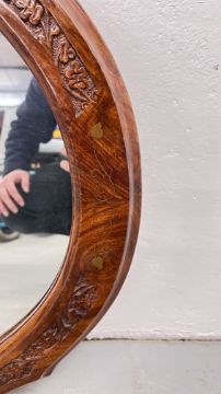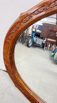 AN OVAL WALL MIRROR IN A CARVED HARD WOOD FRAME, W 90CM, H 63CM.