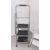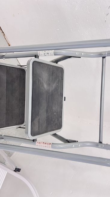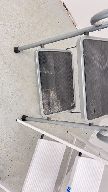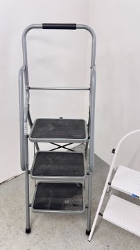 A SET OF STEEL FRAMED 3 TREAD STEP WITH HAND RAIL AND SET OF TWO TREAD ABRU STEPS.