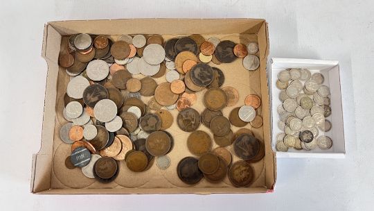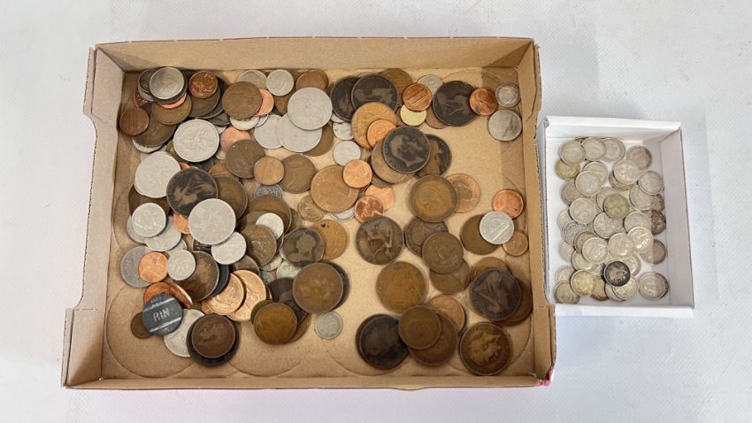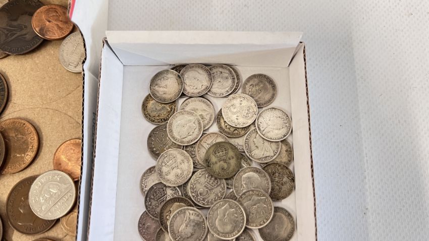 BOX OF MAINLY UK COINAGE INCLUDING 50 PRE-1920 SILVER 3d COINS.