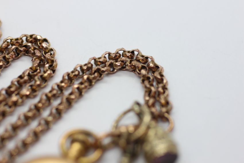 A YELLOW METAL GUARD CHAIN WITH LOCKET FOB AND STONE SET WATCH KEY ATTACHED.