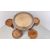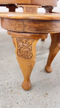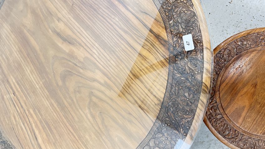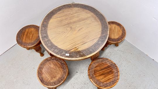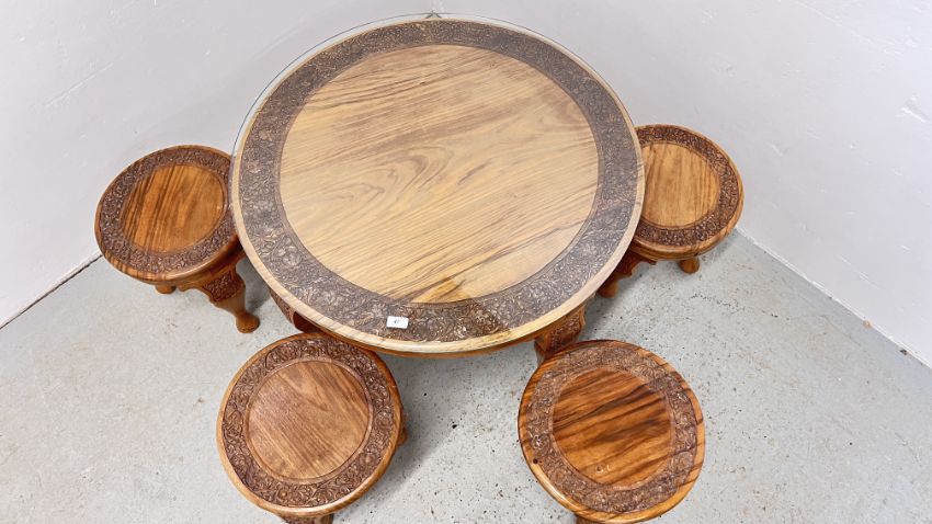 A CIRCULAR HARD WOOD COFFEE TABLE WITH CARVED DETAIL, DIAMETER 87CM WITH FOUR SMALL MATCHING CIRCULAR TOP NESTING TABLES BELOW.