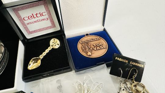 A BOX OF ASSORTED COSTUME JEWELLERY TO INCLUDE BEADED NECKLACES, CHARM BRACELET AND WATCHES, MEDALS AND THIMBLES, PERSIAN STYLE CUFF BANGLE ETC.