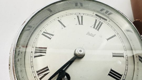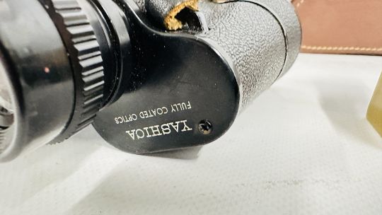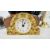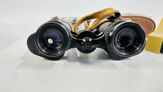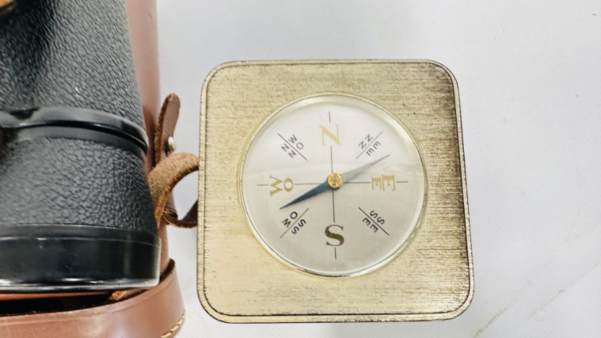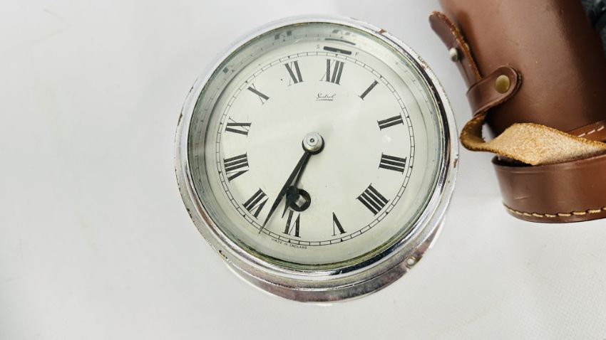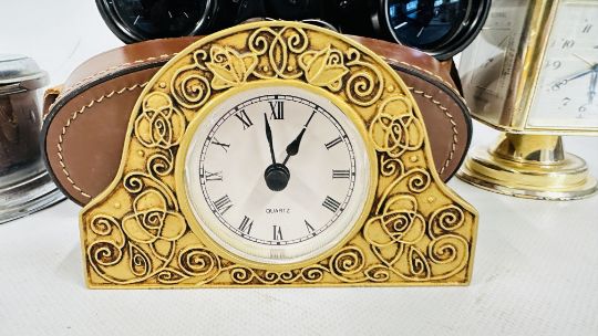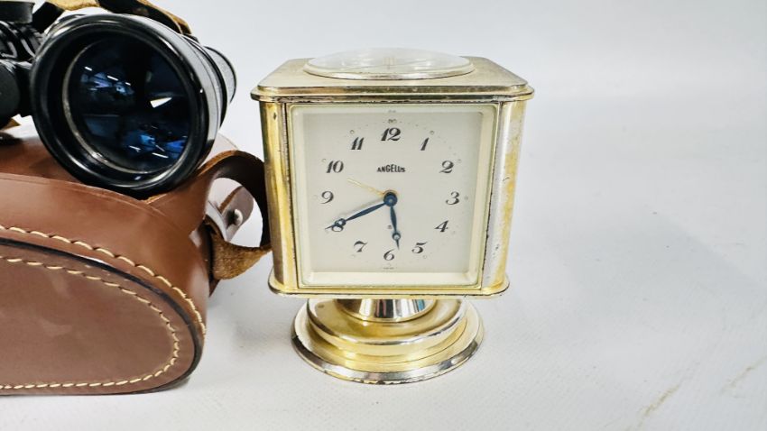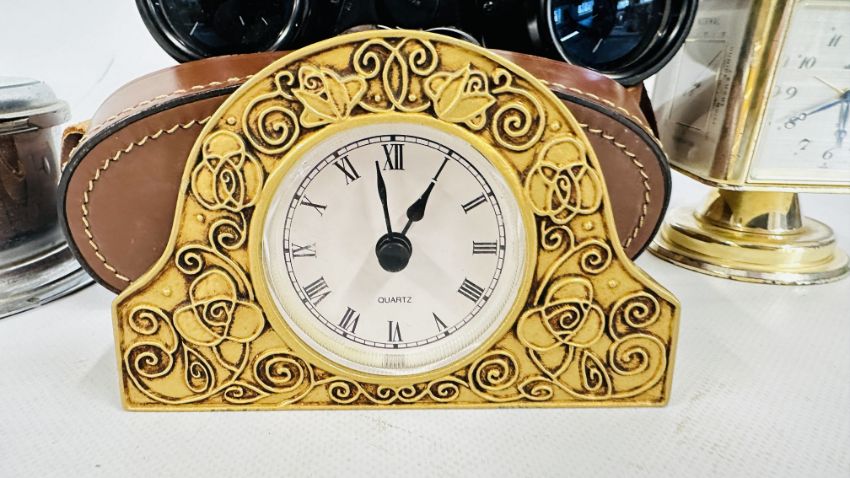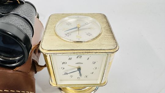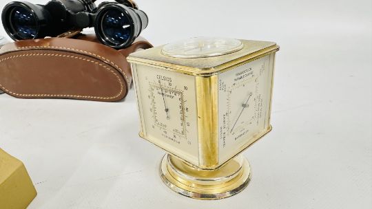 A REVOLVING CLOCK WITH COMPASS TOP, HYGROMETER, BAROMETER AND THERMOMETER, GILT MANTEL CLOCK, YASHICA 8 X 40 BINOCULARS (CASED) + A SESTREL SHIPS BULKHEAD CLOCK.