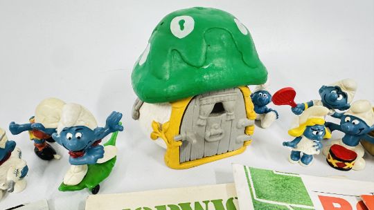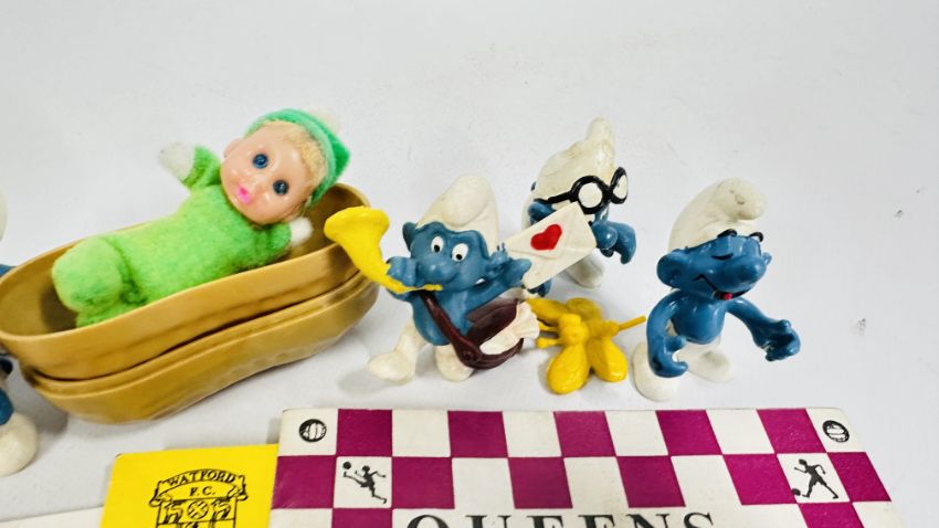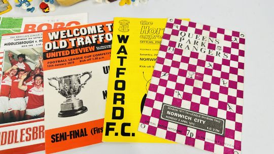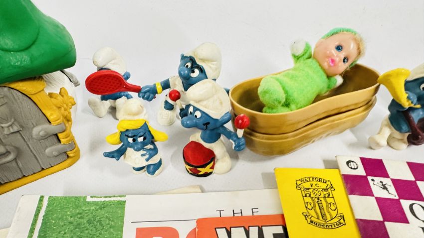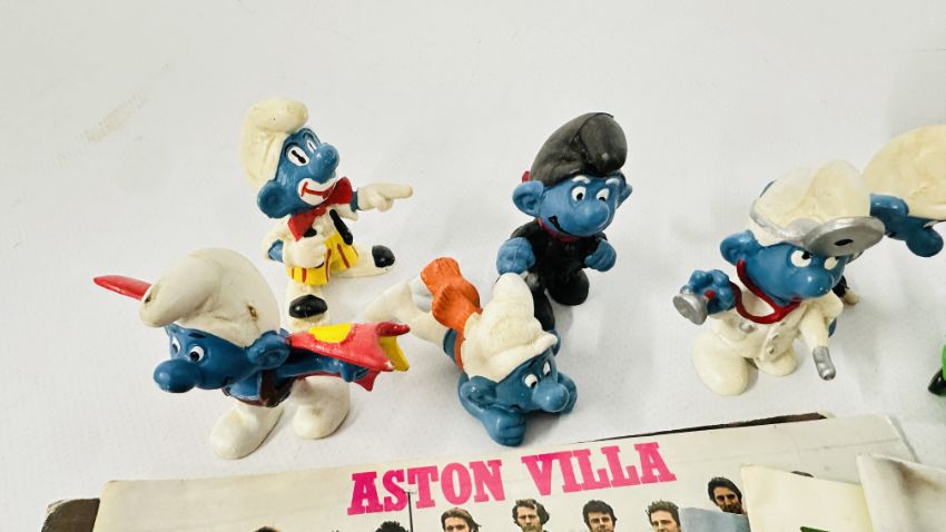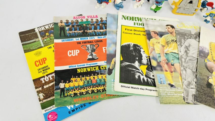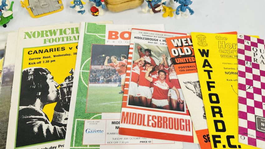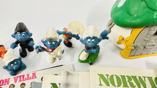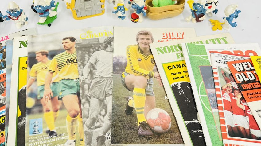 SMALL GROUP OF VINTAGE SMURF COLLECTIBLES + SMALL COLLECTION NORWICH CITY FOOTBALL PROGRAMMES.