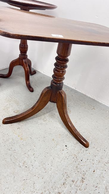 A GEORGE III MAHOGANY RECTANGULAR TOP OCCASIONAL TABLE, REDUCED IN HEIGHT ON PEDESTAL TRIPOD BASE ALONG WITH TWO FURTHER MAHOGANY WINE TABLES ON PEDESTAL TRIPOD BASE.