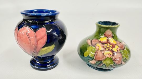 A MOORCROFT POTTERY VASE, MAGNOLIA PATTERN, STAMPED MOORCROFT + A FURTHER GLAZED SQUAT VASE, COLUMBINE PATTERN, H 8CM, STAMPED MOORCROFT.