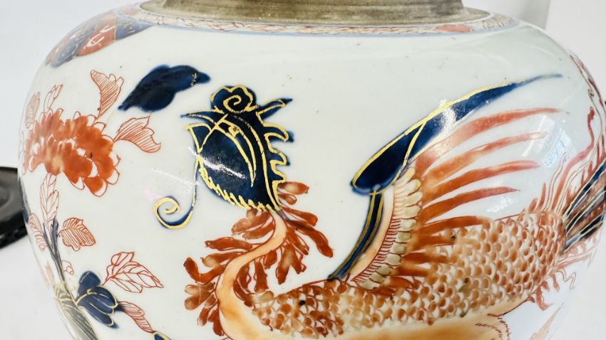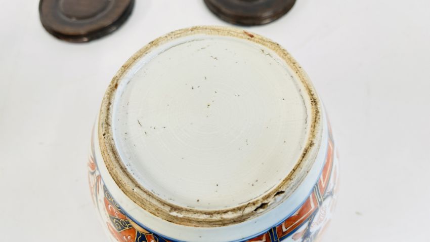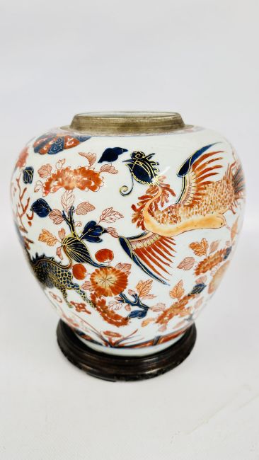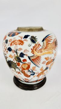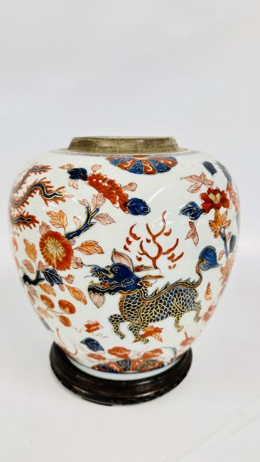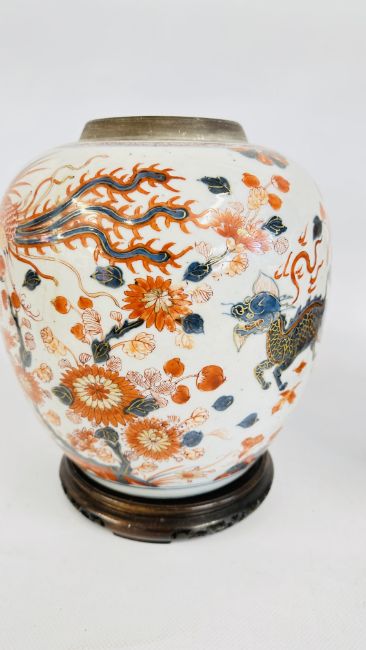 A MATCHED PAIR OF CHINESE PORCELAIN IMARI PALETTE GINGER JARS, DECORATED WITH KYLINS AND PHOENIXES ON A FLORAL GROUND, PROBABLY IN THE KANGXI QING DYNASTY STYLE, H 24CM NOT INCLUDING THE CIRCULAR CARVED OPEN WORK STANDS (NO COVERS) (HAIRLINE CRACK TO THE BODY OF ONE EXAMPLE).