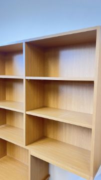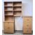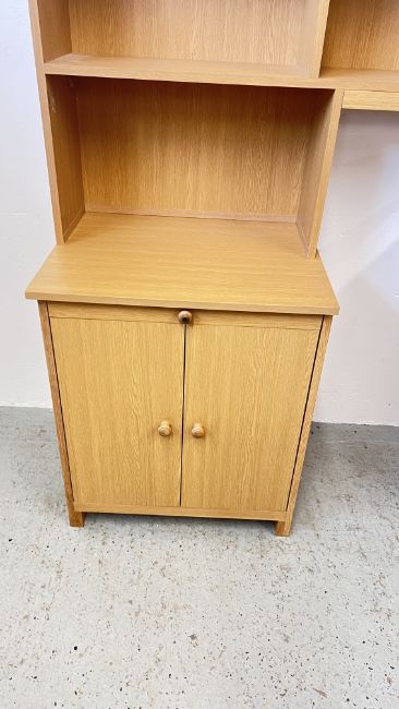 BEECH FINISH TWO DOOR CUPBOARD WITH TOP DESK SLIDE, WALL MOUNTED STORAGE SYSTEM AND 3 DRAWER FILING CHEST.