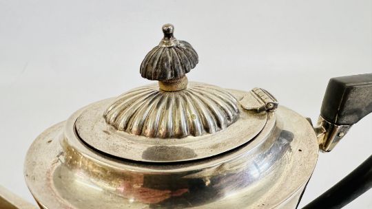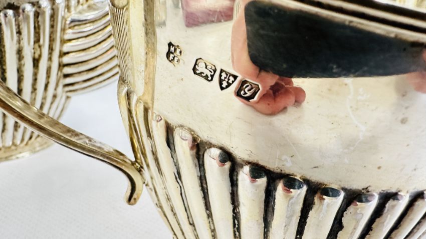 AN ANTIQUE SILVER 4 PIECE MATCHED TEA SET COMPRISING COFFEE POT AND TWO HANDLED SUGAR BASIN, CHESTER 1924 & 1915, MAKER BARKER BROTHERS, TEAPOT BIRMINGHAM 1927, MAKER BARKER BROTHERS AND MILK JUG SHEFFIELD 1926, MAKER JAMES DIXON & SONS LTD.