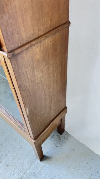 A MAHOGANY 4 DOOR DISPLAY CASE W 160CM WITH KEYS, INTERIOR GLAZED SHELVES WITH GILT BRACKET SUPPORTS.