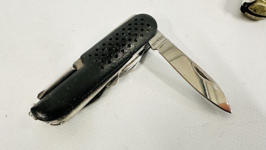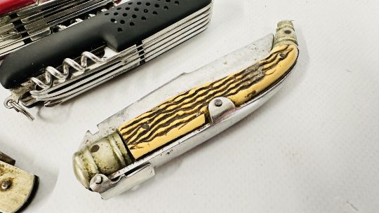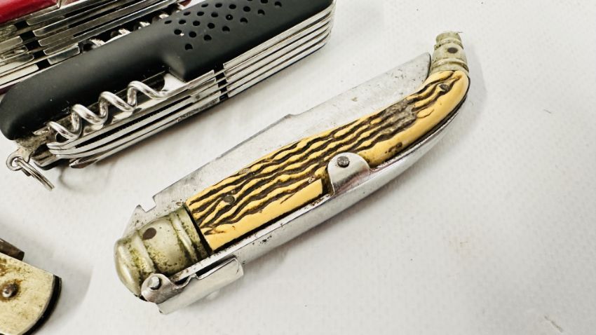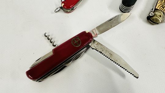 FIVE VARIOUS FOLDING POCKET KNIVES TO INCLUDE "GIRL GUIDES" AND SWISS ARMY EXAMPLES.