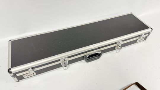 CROWN ALUMINIUM FRAMED FLIGHT CASE FOR SHOTGUN & LEATHER LEG OF MUTTON, 280 & 943.