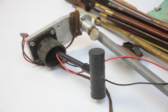 A COLLECTION MIXED GAUGE CLEANING RODS, DUMMY, HORN, 12V LAMP, WINDOW LAMP MOUNT.