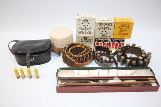 QUANTITY MIXED GAUGE CARTRIDGES INCLUDING 12, 20 AND .410 + CLEANING ACCESSORIES, LEATHER CARTRIDGE BAG AND CARTRIDGE BELT.