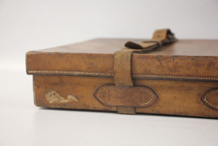 ANTIQUE TAN LEATHER MOTORING SHOTGUN CASE FOR PAIR OF SHOTGUNS BEARING PURDEY GUN MANUFACTURER LABEL.