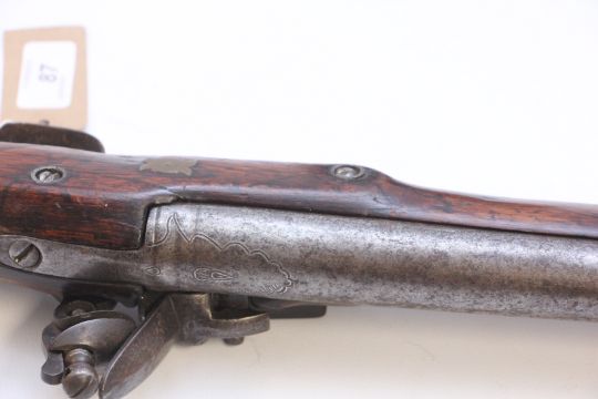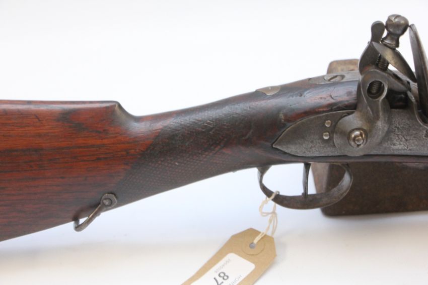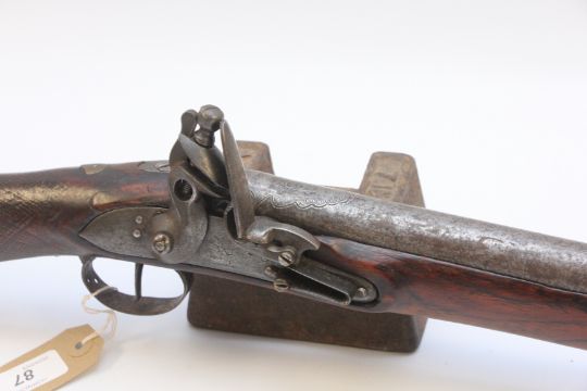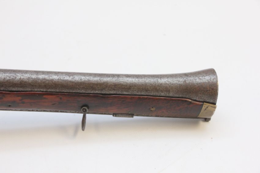 ANTIQUE FLINT LOCK BLUNDERBUSS L 84CM WITH LOADING ROD AND BRASS BANDING - (ALL GUNS TO BE INSPECTED AND SERVICED BY QUALIFIED GUNSMITH BEFORE USE)