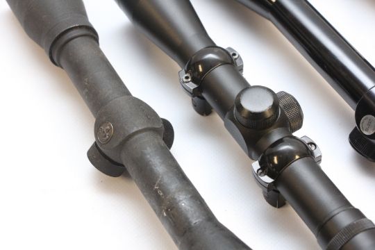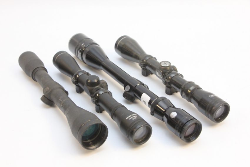 4 X VARIOUS RIFLE SCOPES TO INCLUDE TASCO SILVER ANTLER WITH MOUNTS, TASCO 6-24X40 NO MOUNTS, NORCONIA 4X32 WITH MOUNTS AND SIMMONS WHITETAIL CLASSIC 4X40 NO MOUNTS.