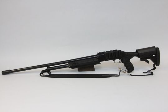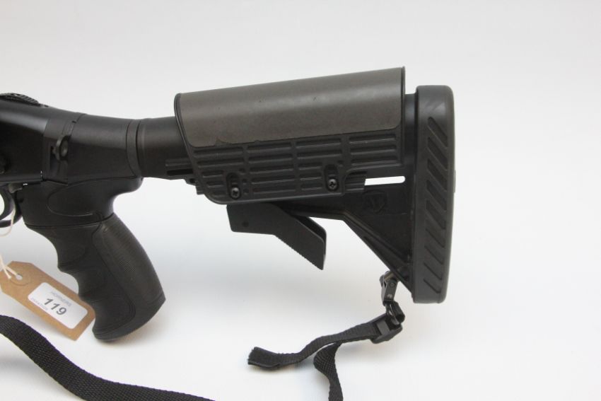 MOSSBERG NEW HAVEN 600AT 12 BORE PUMP ACTION SHOTGUN MULTI CHOKE, TOTAL 1 CHOKE, ADJUSTABLE STOCK, LASER, TORCH, 5 CARTRIDGE MOUNT AND GUN SLING - 3 SHOT - #H693291 - (REF: 1907) - (ALL GUNS TO BE INSPECTED AND SERVICED BY QUALIFIED GUNSMITH BEFORE USE)
