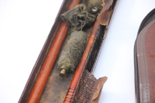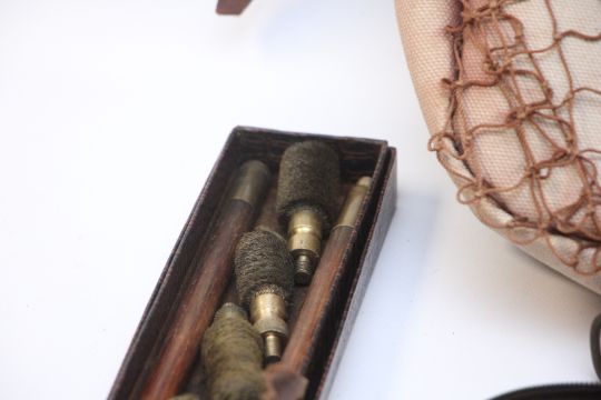 A GROUP OF SHOOTING ACCESSORIES TO INCLUDE GAME BAG, GUN SLEEVES, CLEANING KIT.