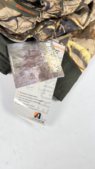 AS NEW SIZE L PODIUM SKEET JACKET, AS NEW QUALITY LEATHER 12G CARTRIDGE BELT AND AS NEW PERCUSSION SIZE 38 TROUSERS CAMO.