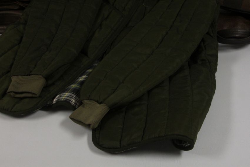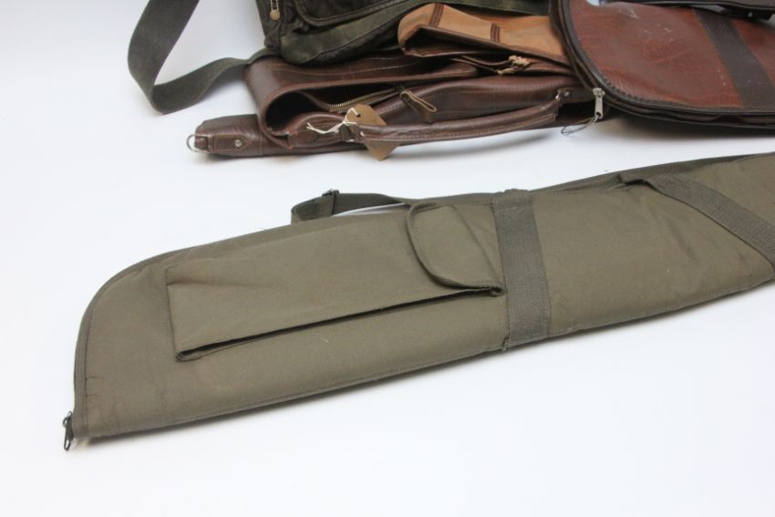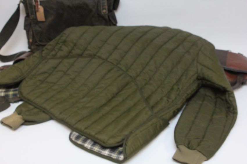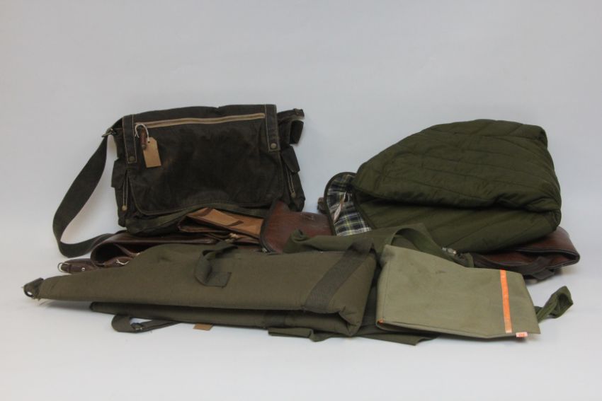 BARBOUR QUILTED JACKET SIZE L, GREEN COTTON SPORTING WAISTCOAT, WAXED COTTON SHOOTING BAG, SLING BAG AND FOUR VARIOUS GUN SLEEVES.