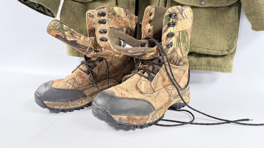 PAIR OF THINSULATE SIZE 11 BOOTS AND SADDLE XXL JACKET.