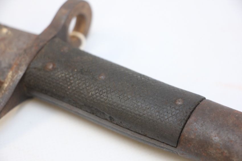 ANTIQUE BAYONET WITH SCABBARD BLADE MARKED 10/32 HILT MARKED SVTC, LENGTH 44CM.