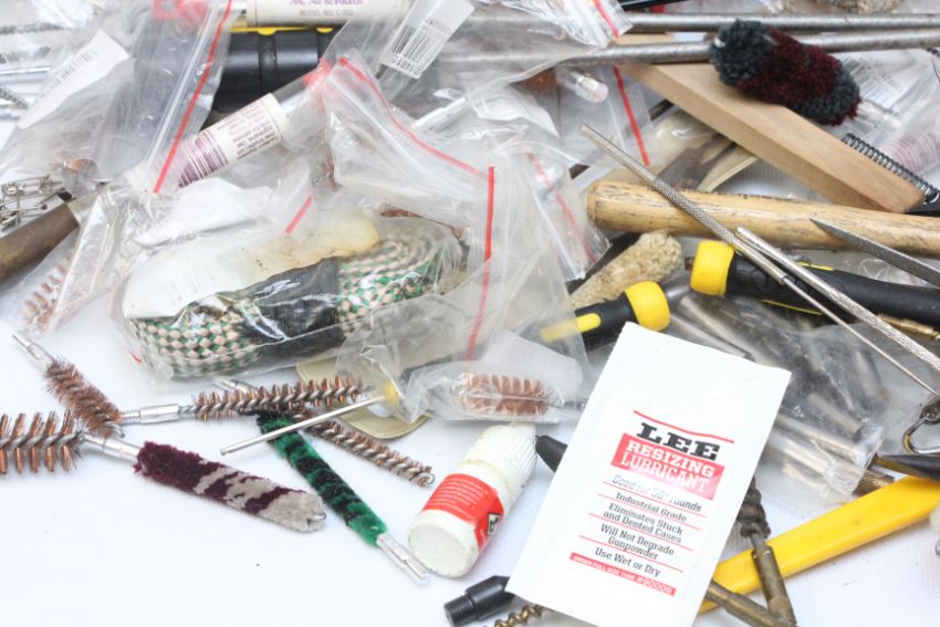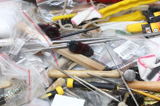 BOX CONTAINING QUANTITY RIFLE AND SHOTGUN CLEANING RODS, BRUSHES AND LUBRICANTS.