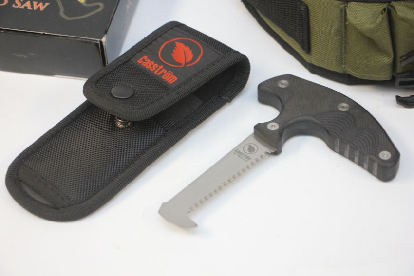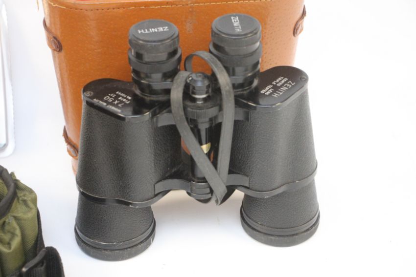 GROUP OF SHOOTING ACCESSORIES TO INCLUDE BISLEY RIFLE BIPOD, CASSTROM NO. 7 FIELD SAW, CARTRIDGE BELT + BINOCULARS.