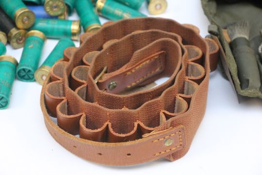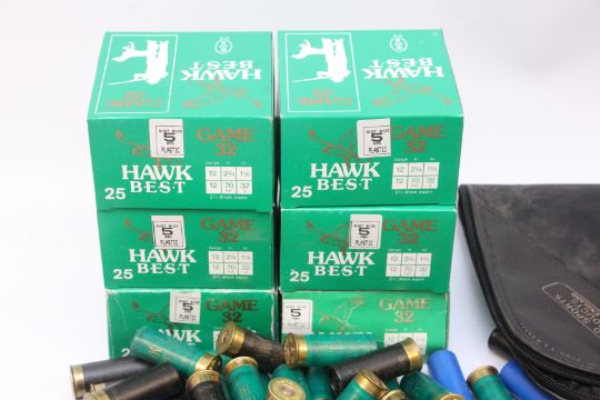 APPROX 235 ASSORTED 12 GAUGE CARTRIDGES INCLUDING HAWKE BEST GAME 32 + CLEANING ACCESSORIES, CARTRIDGE BELT, ETC.