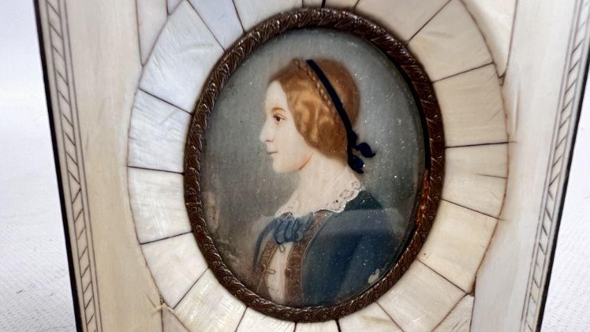 A LATE C19TH STYLE ITALIAN (FLORENTINE) MINIATURE OVAL PROFILE PORTRAIT OF A GIRL WEARING A BLUE HAIR BAND AND LOOKING TO DEXTER IN RECESSED BONE FRAME (W 8 X H 9CM OVERALL).